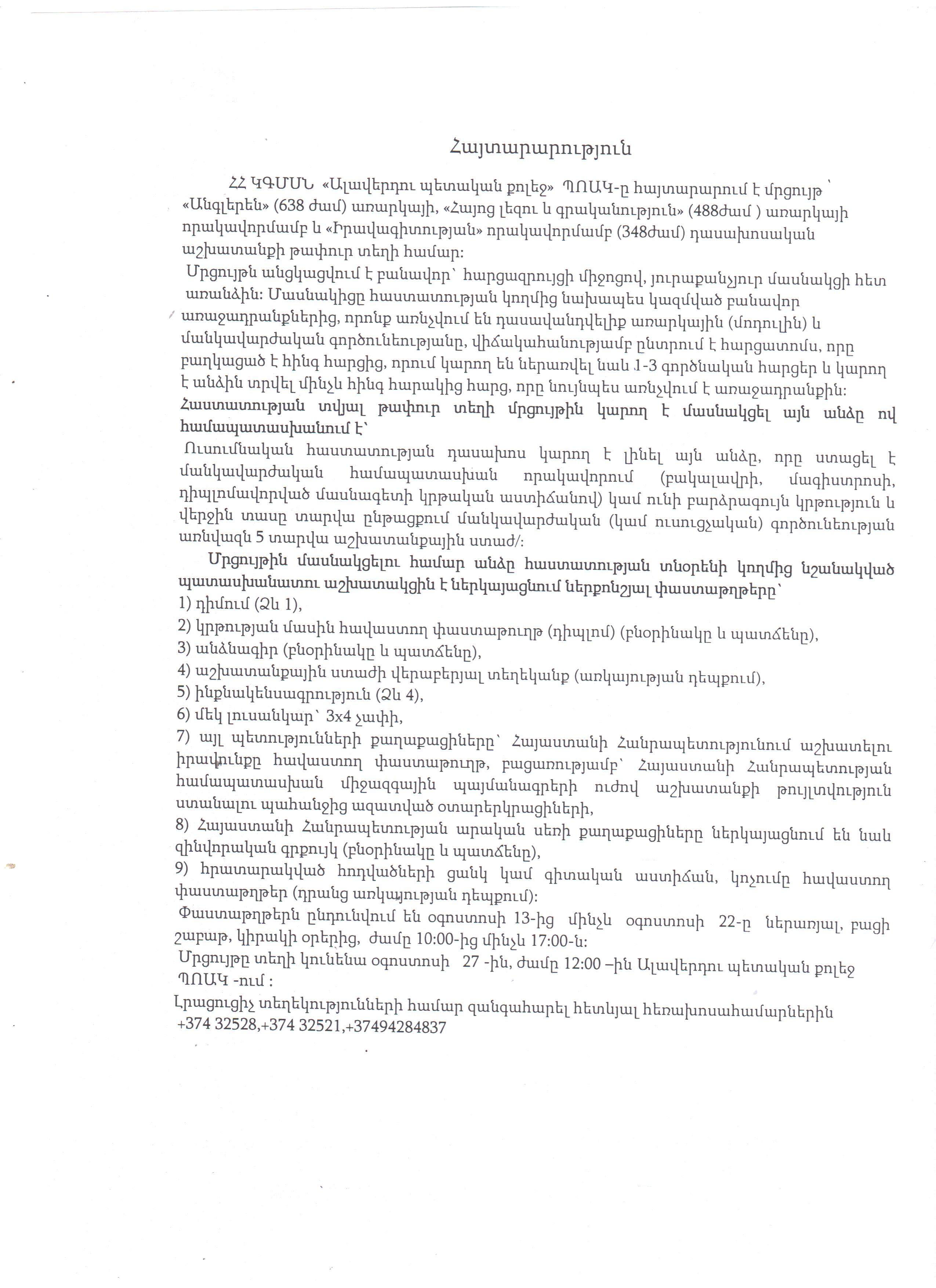 Вакансии Алавердский государственный колледж Сообщение от wrdprss.admn@gmail.com В августе 21, 2025 0 Комментарии В Алавердском государственном колледже есть вакансии. Объявление Объявление