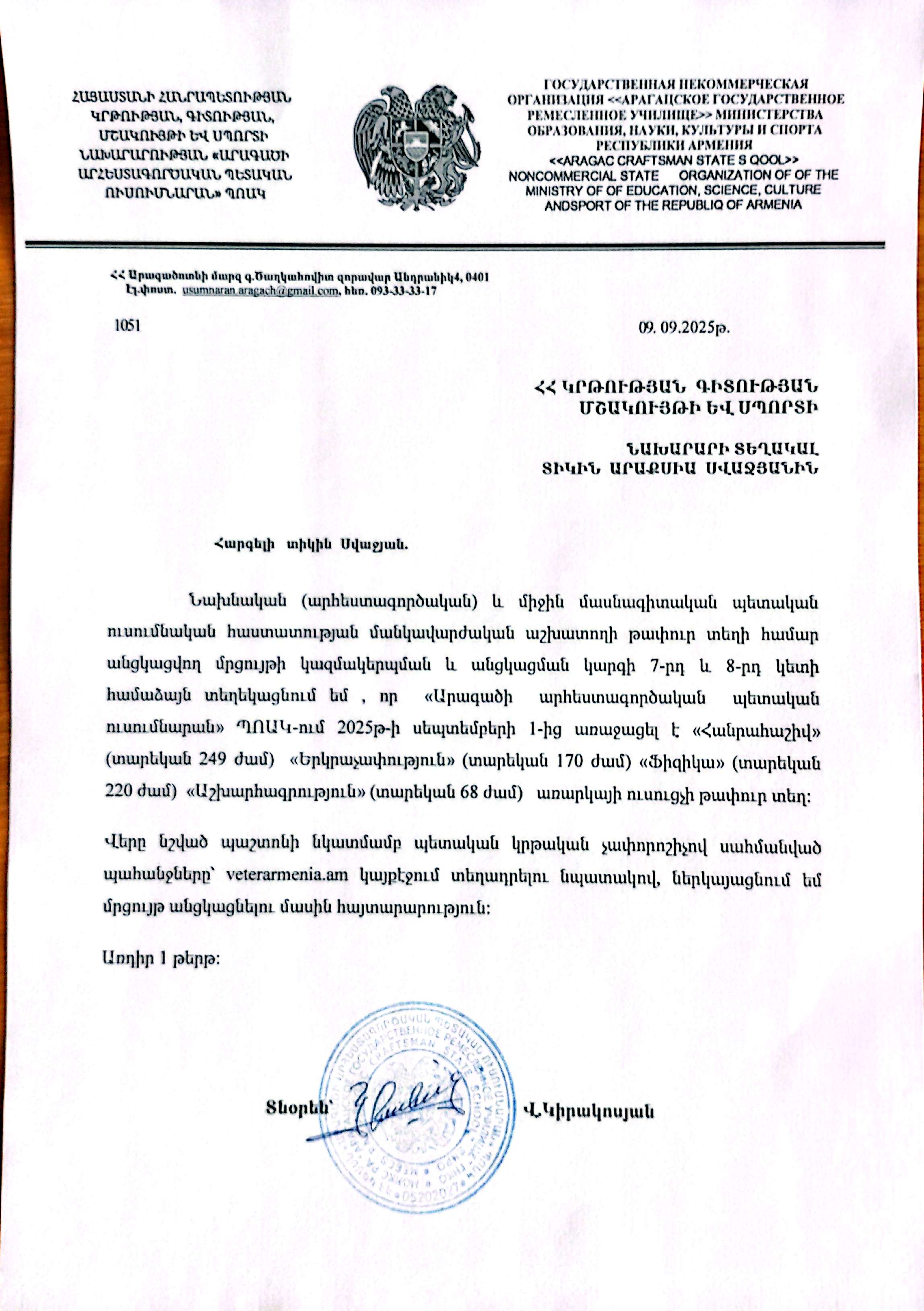 Вакансии Арагацкое государственное профессионально-техническое училище Сообщение от wrdprss.admn@gmail.com В сентябре 10, 2025 0 Комментарии В колледже профессионального государственного колледжа есть вакансии учителей.: Объявление Объявление