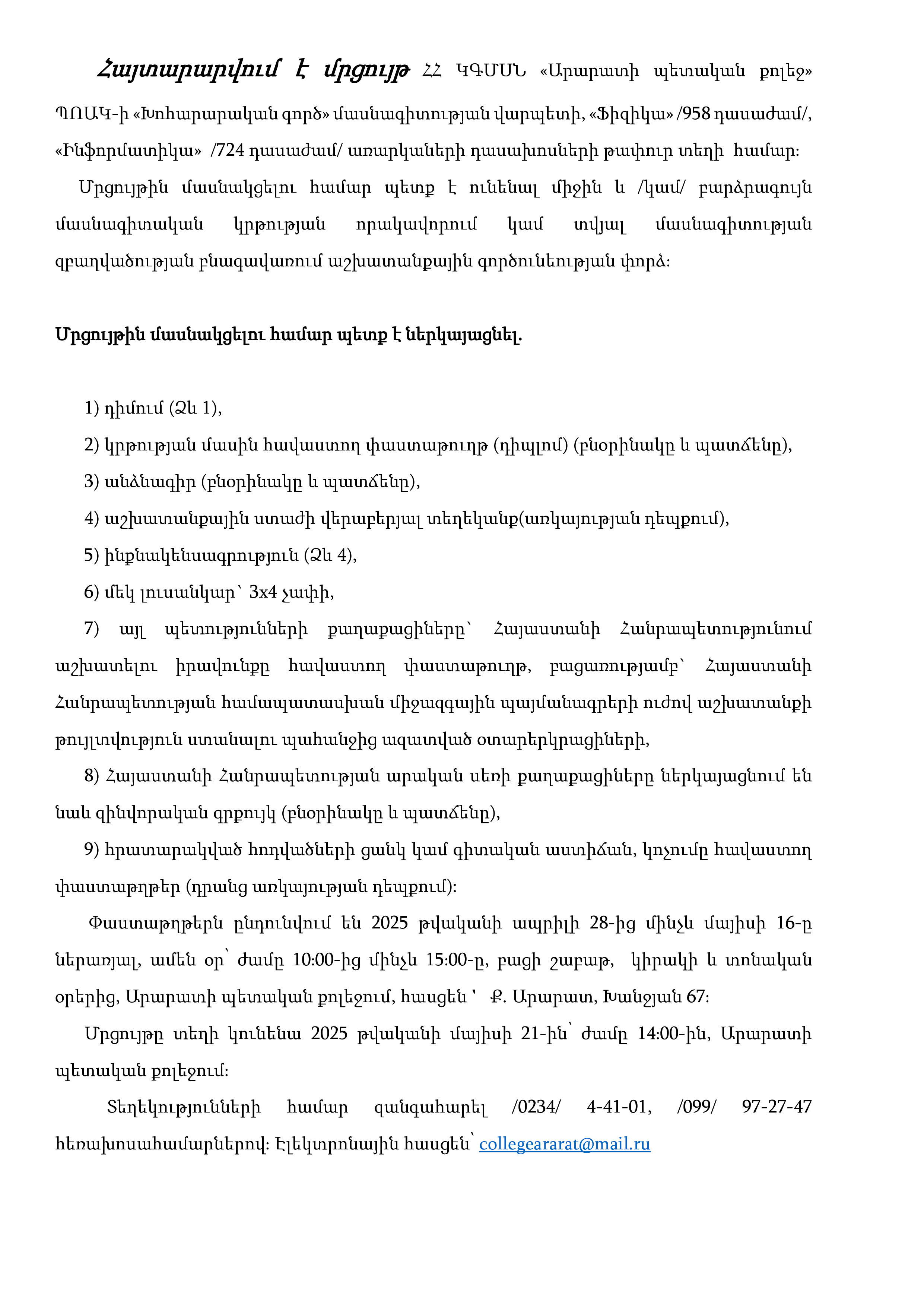 VACANCIES Ararat State College Posted by wrdprss.admn@gmail.com On April 29, 2025 0 comments There are vacancies at Ararat State College: Announcement Announcement