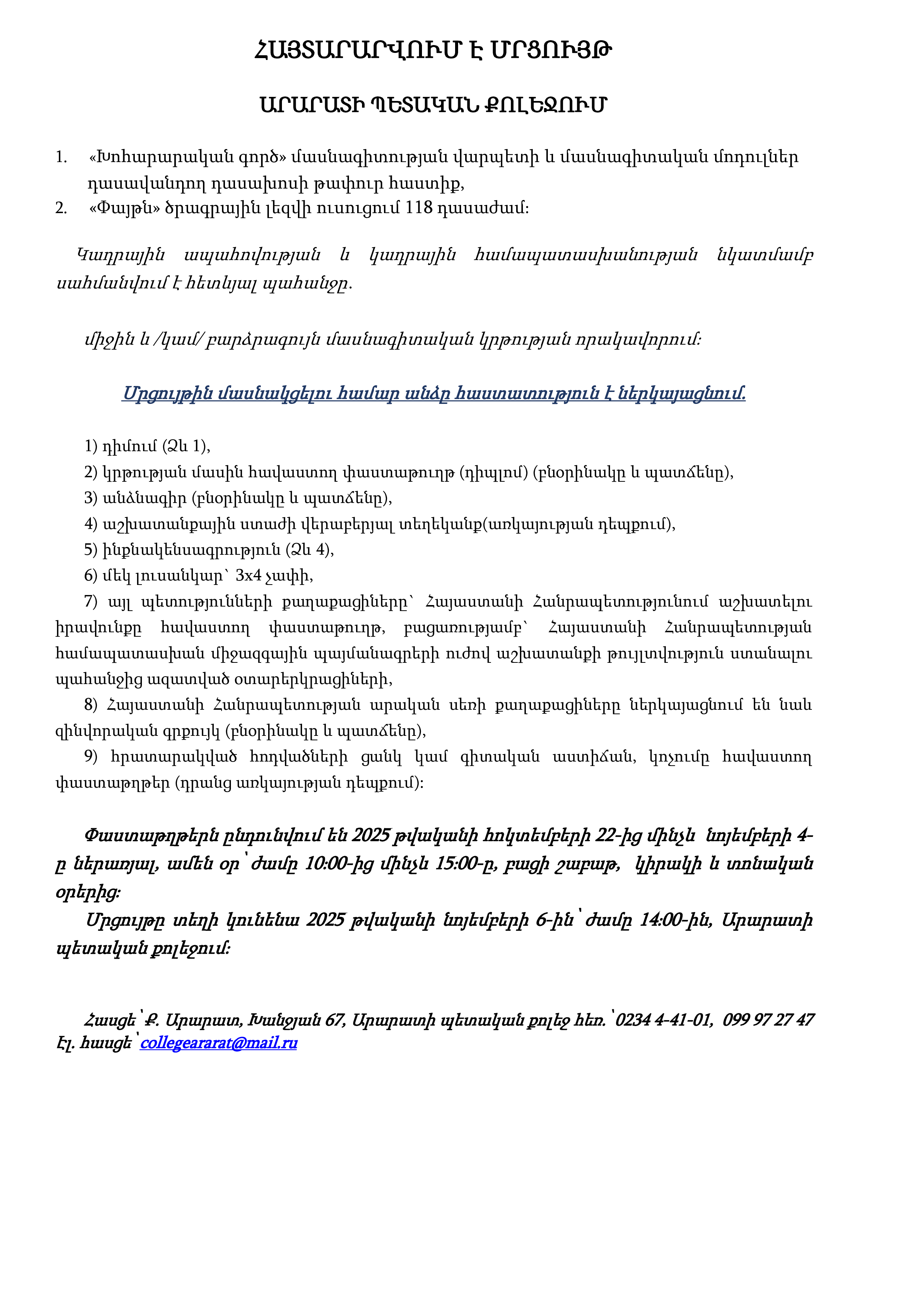 VACANCIES Ararat State College Posted by wrdprss.admn@gmail.com On October 22, 2025 0 comments Ararat State College announces a competition for vacant positions: Announcement Announcement
