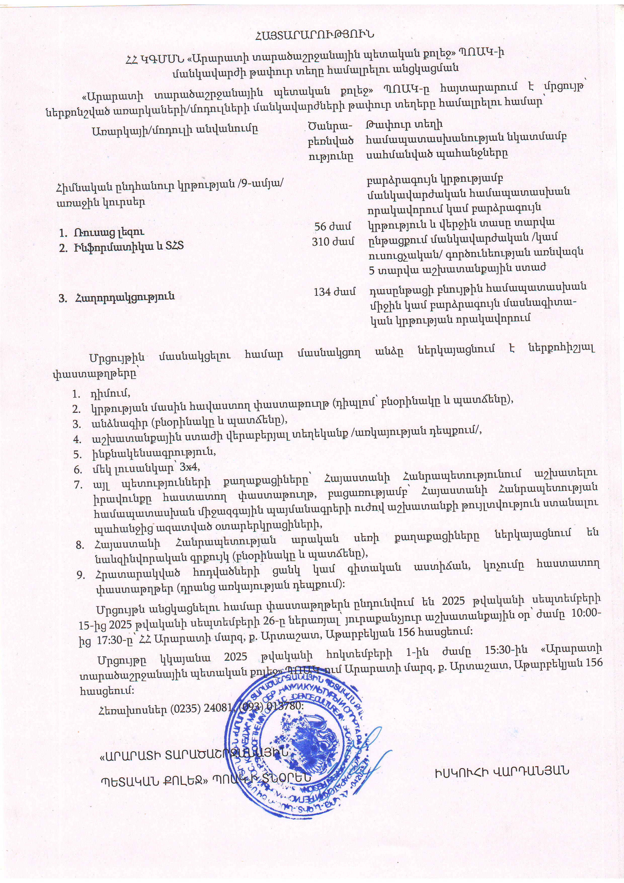 VACANCIES Ararat Regional State College Posted by wrdprss.admn@gmail.com On September 16, 2025 0 comments There are vacancies for educators in Ararat Regional State College: Announcement Announcement