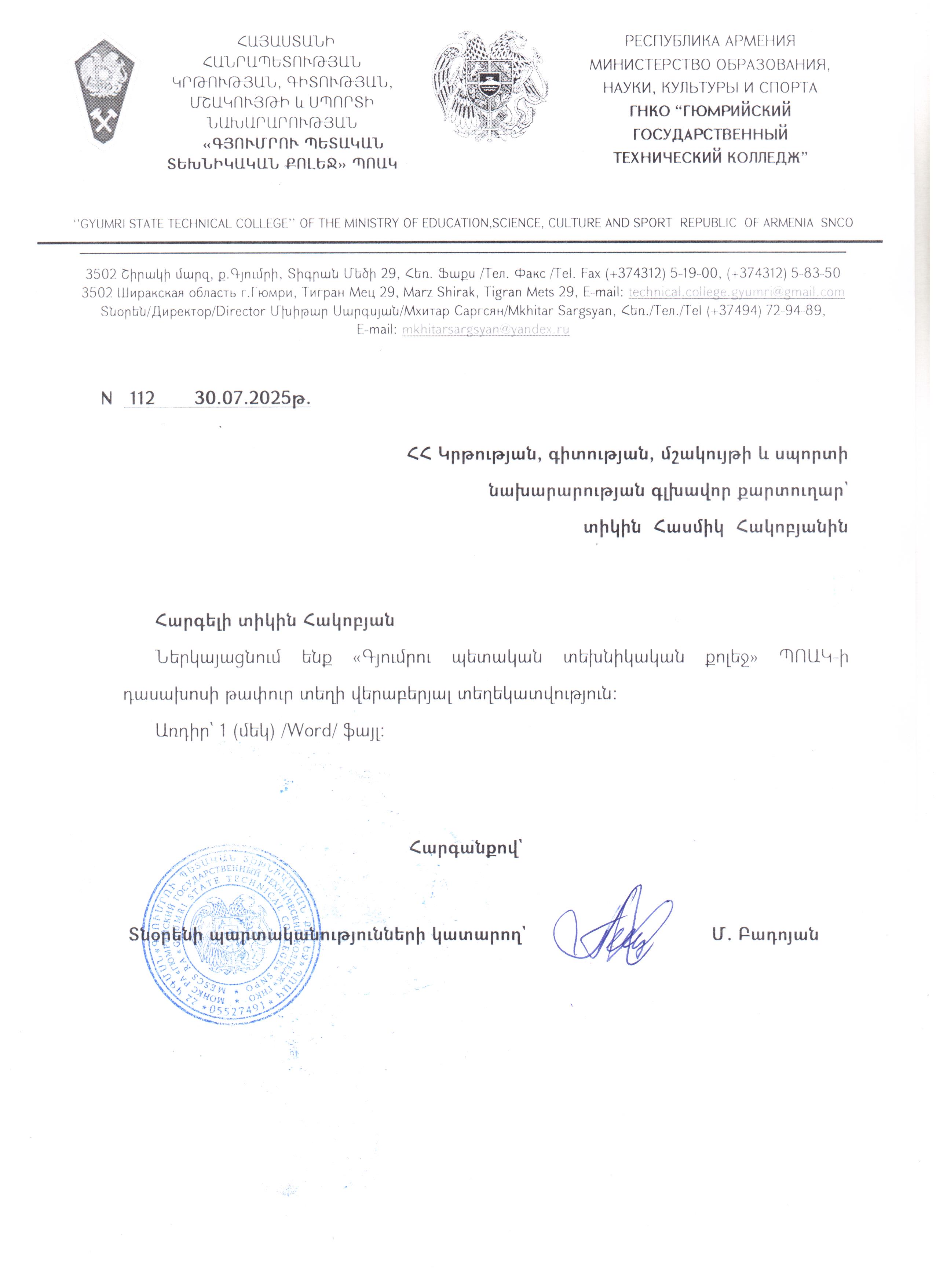Гюмрийский государственный технический колледж объявляет конкурс на вакантную должность преподавателя.