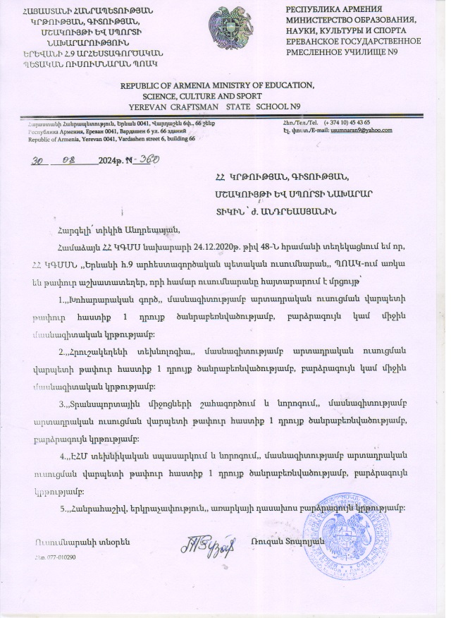 Yerevan Number: 9 արհեստագործական ուսումնարանը հայտարարում է թափուր հաստիքների մրցույթ։