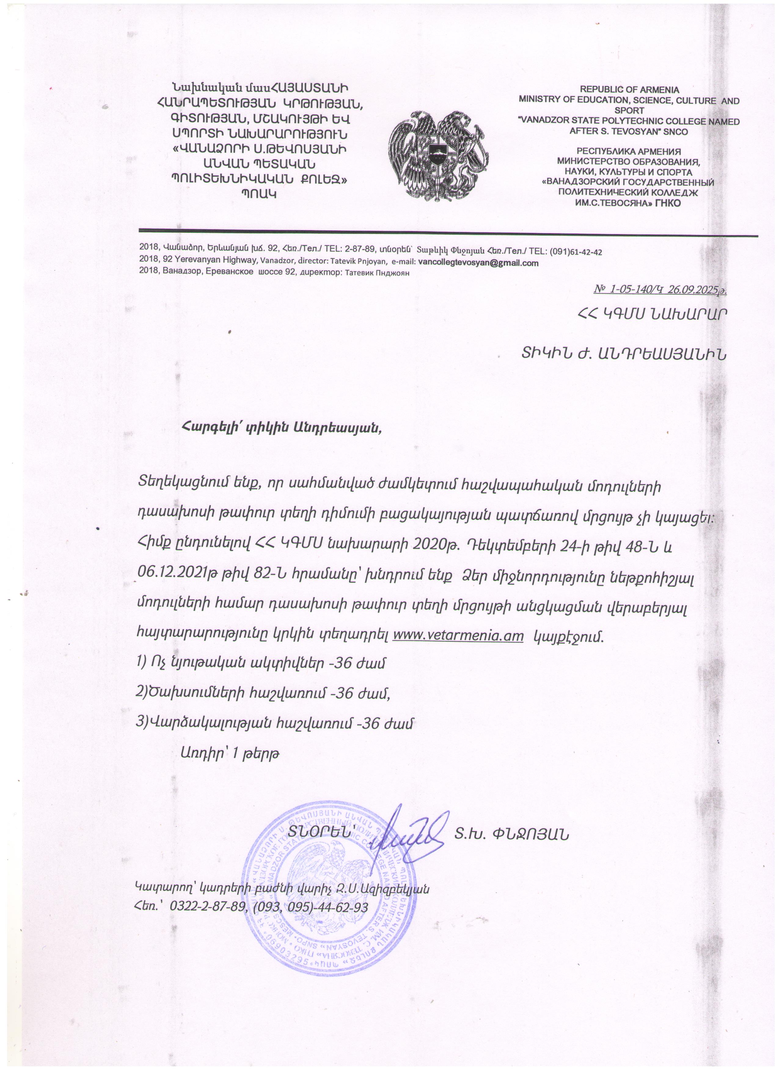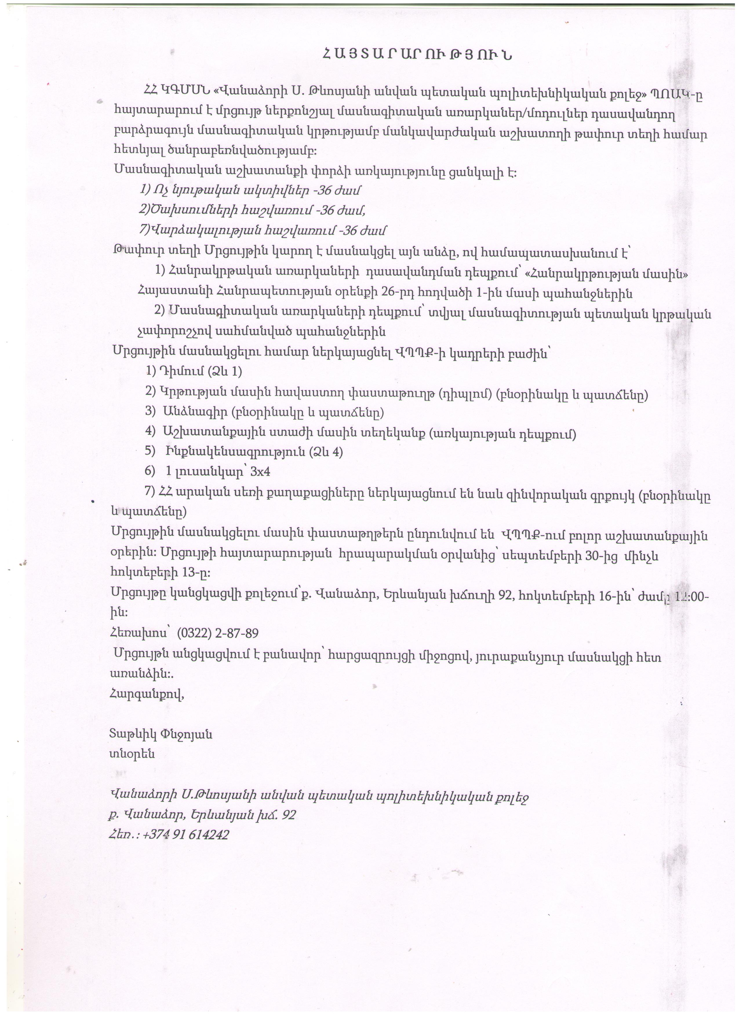Վանաձորի Ս. Թևոսյանի անվան պետական պոլիտեխնիկական քոլեջըը հայտարարում է մրցույթ՝ թափուր տեղի համար: