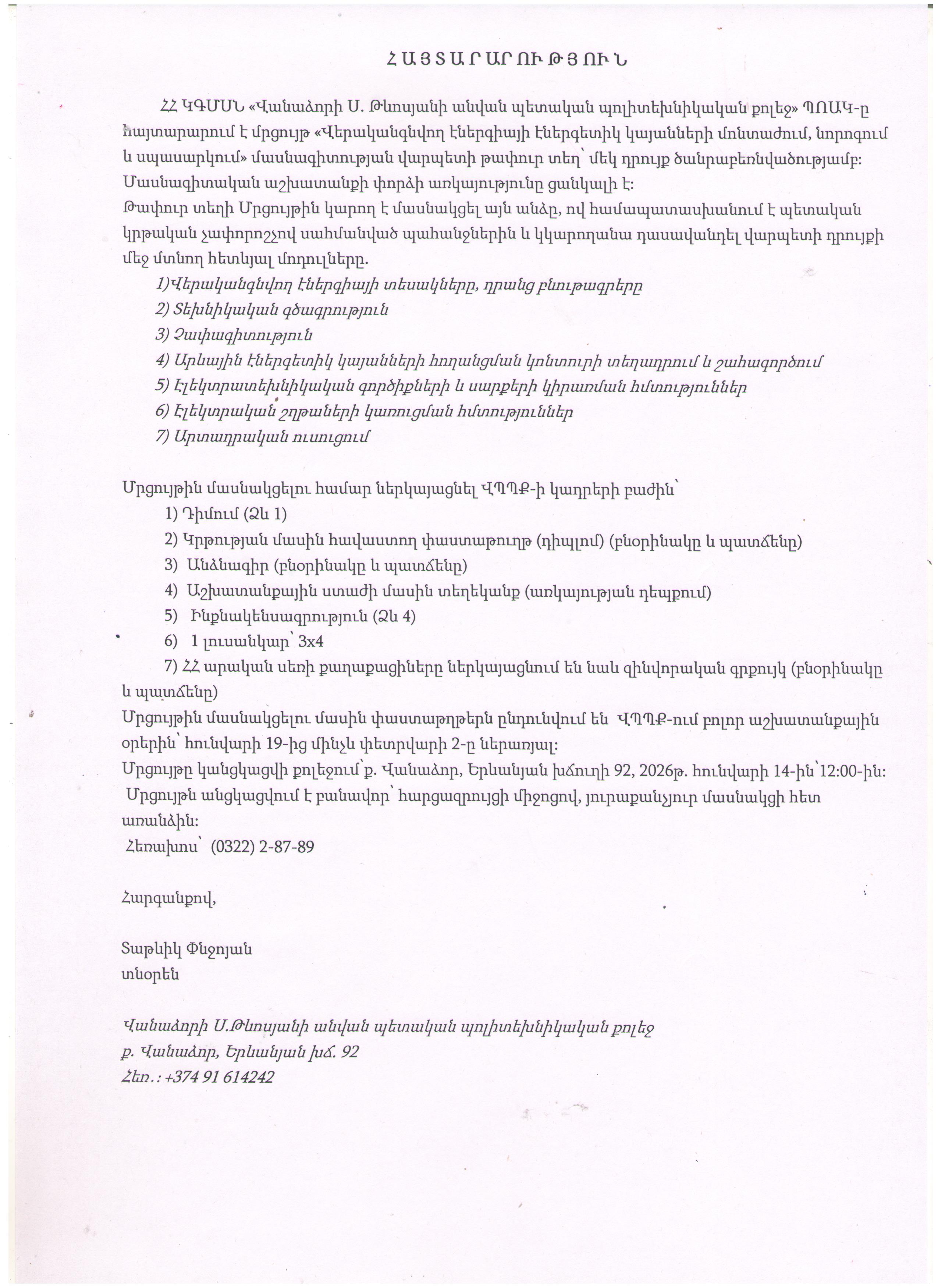 Վանաձորի Ս. Թևոսյանի անվան պետական պոլիտեխնիկական քոլեջում առկա է «Վերականգնվող էներգիայի էներգետիկ կայանների մոնտաժում, նորոգում և սպասարկում» մասնագիտության ուսուցման վարպետի թափուր տեղ: